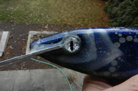 I donate these lures to various groups, mainly ones that support our veterans and other civic activities. For me making lures is just a hobby to while away the winter hours. On all the lures with aluminum lips I secure the lip with a screw which penetrates the lip and runs into the head. The screw head is recessed and epoxied over so you won't see the screw on these lures.