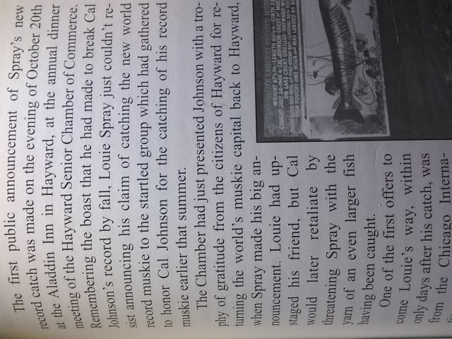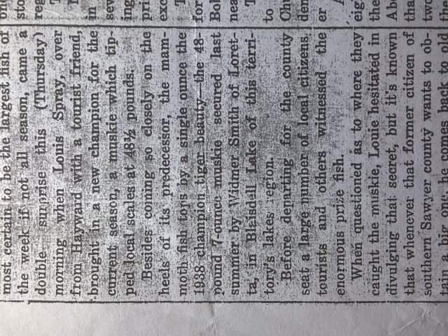 Posts: 43 Location: S. Wisconsin | Excellent job Larry Ramsell, keep up the good work! I have always found the Strife and Crimes of Louie Spray to be fantastically entertaining. As a side note to your post, I think we know how big Louie's 1939 fish was; it was 48.5 pounds or LESS. I submit as evidence a copy from the July 27, 1939 Sawyer County Gazette. This is the DAY Louie allegedly "caught" his 1939 59-pound, 8-ounce "World Record". * Just as the paper was going to print, it appears Louie got them to HALT the presses to include his magnificent catch that morning; A 48-pound 8-ounce fish, that bested last seasons largest caught by Widmer Smith by a mere OUNCE... (he he!!) This was the ONLY fish Spray "caught" that day; "caught this Thursday morning"... July 27th, 1939. In print. Undeniable. No 59-8 in sight. Never happened. The photos were probably not usable, meaning the fish didn't look big enough, and the photo of Van Camp with fish is probably unrelated to the 1939 catch. So the indisputable fact is that the "World Record" fish Louie "caught" on July 27, 1939 WAS LISTED IN THE NEWSPAPER as 48.5 pounds (probably AFTER being loaded, with the idea of ONLY beating Widmer AT FIRST.) This alone is evidence of fraud, and would be sufficient to dismiss all OTHER Spray "records" according to the FWFHOF's own rules. PS Does anyone know what big event occurred in the town of Hayward on October 20th, 1949? Hint: It happened at "The Aladdin Inn", see p. 213 of "Three Record Muskies in his Day"... * File size too big to upload, bummer. Will try again later. Edited by IGotTheFeverBIG 3/8/2018 8:26 AM | ||