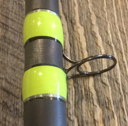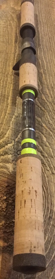 Handcrafted 9-0 Extra Heavy with a split cork, 15 inch grade A cork handle, Fuji reel seat, stamped frame guides, chartreuse/silver thread, and SiC tip top. Love this color combo.