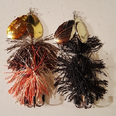 I made some baits for our banquet in 9 days. The biggest chatterbait is 12.5"long. The bucktails havs different sized blades and a 1oz weight in the middle to keep it riding level. For some reason i had to downsize down to 375 pixels to be able to post. Only 150kb.
