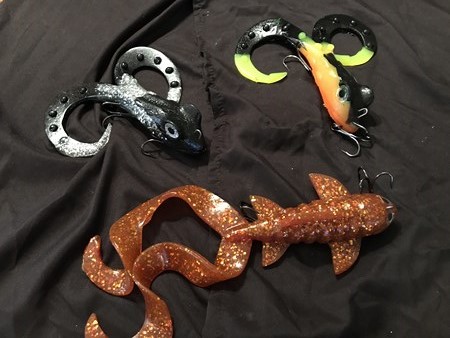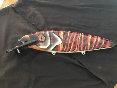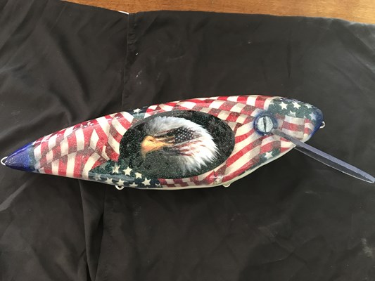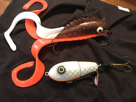 Here are some custom lures for the auction. The Flag lure is 14" long by 3" wide!!Made by Gringo Loco, next we have a husky meddusa and a DR. Evil from TRO. That,s followed by a Skol toad, and a #9 revolution from Lake X lures, and Kramer Bros tackle. The next photo is 2 10" phantoms. The Red/Copper one is a custom 1 of 3 painted by Todd. Lots more photos and guide trip info to come!