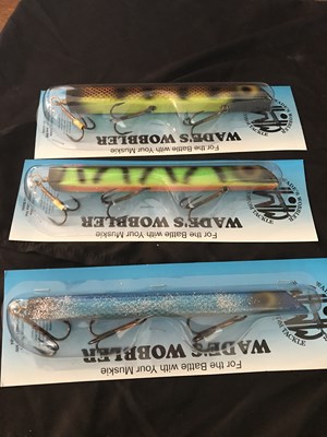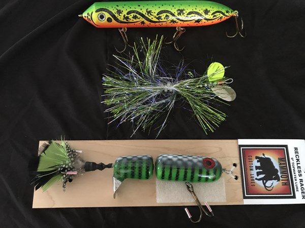 3 more lots, We have a Water moccasin glide bait, a double 5 muskie metal bucktail, and a custom 9" reckless rager Mammoth lures topwater. It is a beauty, We also have a lot of 2 regular Lake X toads, and a tulibee. Next we have 3 wades wobblers, 2 deep runners and a regular one donated by Wades custom tackle.