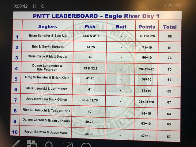 Brian Scheffer and Sam Ubl lead with a 38.5 and a 31.5, and 88 points. Eric and Gavin Burseth are in second just 7 points back with a single 44.25" fish, the big fish today. It's going to be a shootout tomorrow, as the lower number of muskies caught allows anyone in the field with a good day tomorrow to challenge for the win.