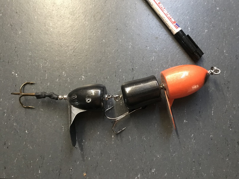 Posts: 2325 Location: SE, WI. | I started building my Double Headbanger back around 1993. Got the Idea from Hi-fin dbl teaser tail, which had 2 props in rear of bait. Problem was the pressure the front prop put on the back, and rear prop would freeze up. They pinched a Rivet, but rarely held position on wire. I put a slight bend in Wire in front of rear prop, similar to the topper stopper bend ,BUT not quite aggressive, then Matched up a solid beads hole,W/wire Diameter, then pinched it in vise + superglue, so middle body would not touch rear rotation prop. Caught lots of nice fish on these...with zero line twists... JD
