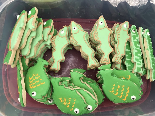 Camp fish fry was kick fanny. NICE work, everyone! The Muskie cookies were joined by Crappie, Bass, and Bluegill, and Walleye, too.