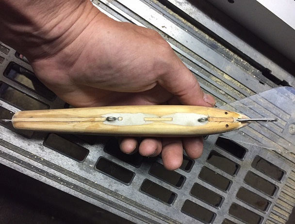 Posts: 141 | These pics show how I go about building my thru wire baits when using the belly slot method. I fill in the slot with strips of the same wood used to make the blank. Some baits have been known to split or separate at the seam over time due to the wood expanding/contracting. This helps to eliminate that. The strips are cut to fit tight against the wire and are tapped or pressed into place using Devcon 2-ton epoxy. It's a bit less messy than filling with resin and extremely durable. A lot would have to happen before these baits would ever come apart. Edited by All Eyes 9/4/2018 11:17 PM Attachments ---------------- thru wire small.jpg (84KB - 465 downloads) thru wire small3.jpg (118KB - 464 downloads) thru wire small2.jpg (113KB - 512 downloads) thru wire small4.jpg (137KB - 516 downloads) | ||