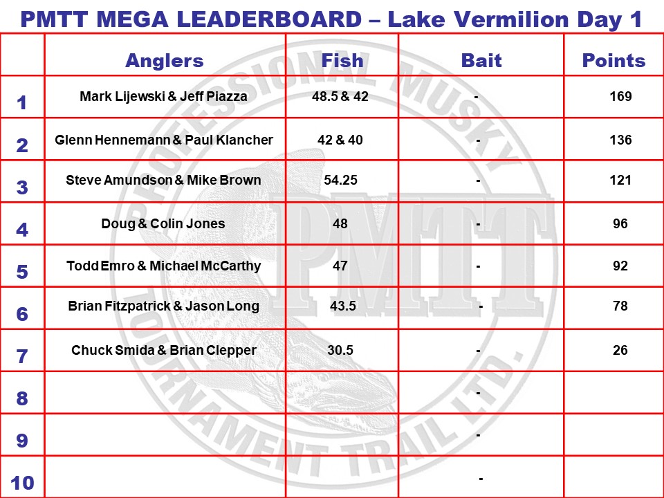 | Jump to page : 1 Now viewing page 1 [30 messages per page] Muskie Fishing -> General Discussion -> Lijewski & Piazza Lead Vermilion Mega Tournament -Day 1 |