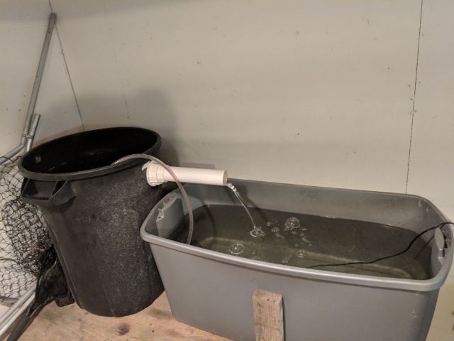 Posts: 16632 Location: The desert | T3clay - 9/25/2018 8:30 PM Guys, if you are keeping suckers for any amount of time build a biofilter... It is a no brainer you can build this whole system for $30 and it is 100% maintenance-free, never change the water..... An image is below the black garbage can is my bio filter, the gray tote is my sucker tank. There is a pump that pumps water from the tank into the biofilter, inside the biofilter is lots of landscape plastic. Any plastic will do. The water then overflows back into the sucker tank creating aeration. There is no need for an aerator in this system. I can keep 30 suckers alive in here all fall long and I never change the water. Inside the biofilter is the plastic, how it works is there is so much surface area for bacteria to grow on that the bacteria will eat any chemicals put out by the suckers. the only catch to this system is make sure you start with a small number of fish to build up the bacteria, if you dump 30 suckers in here on the first day it will take longer for the bacteria to grow and you will lose some fish. If anyone has any questions just let me know, I see a thread like this every year, and every year I try to educate people on a biofilter. How big of suckers are you buying? Can't see 30 12-15 inch suckers staying alive in that little tote for very long. Good idea though, I'm doing the same with my big cattle tank. | ||