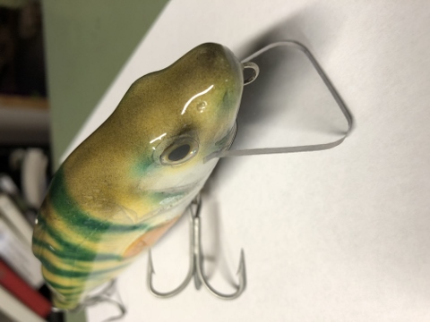 Posts: 54 | Here's a bait I originally made to be a slow rising crank/jerkbait. To that effect, it worked well, had good action & thump and caught fish (the best action I can get is my priority and I'll usually go through several prototypes dialing it in before pretty-ing up a bait). I carved the original out of wood and made a mold so reproductions could be poured with resin. A while back I had a "happy accident" when I was pouring a few of these and strayed from my recipe, doubling the amount of micro-balloons in the mix. It was too late at that point to change so I poured it anyway and finished the bait as normal with the same weight scheme and lip as the slow risers. Holy cow was I surprised at what this bait does with the much lighter resin mix. I knew the rise would be faster but wasn't prepared for the overall difference in the baits behavior. It ended up by shear luck having just barely enough weight to keep the bait from blowing out making this thing just super squirrely in the way it comes through the water doing everything except rolling over. It randomly digs or hunts while almost 90 degrees on it's side then to a hard crankbait action or hunting on it's other side or weird wobbles. It's just strange and unpredictable and catches better than the original design. As a jerk or twitchbait it does the same sort of stuff but if you include slack line it'll sometimes act like a glider or turn almost 180. I don't make the slow rise version any more. This example was a bit hastily painted but accurately matches the perch that come out of my dirty water home lake. I could've used a better eye on it but I didn't feel like making any and used what I had laying around that would fit the socket. Darn musky put tooth marks in the top of the bait on it's maiden voyage, I couldn't wait until the epoxy was completely cured... Edited by 1VW 1/16/2019 11:29 AM Attachments ---------------- IMG_1527 (360x480).jpg (82KB - 612 downloads) IMG_7342 (360x480).jpg (93KB - 544 downloads) IMG_1528 (360x480).jpg (80KB - 592 downloads) IMG_7344 (360x480).jpg (53KB - 581 downloads) IMG_1526 (360x480).jpg (86KB - 622 downloads) | ||
