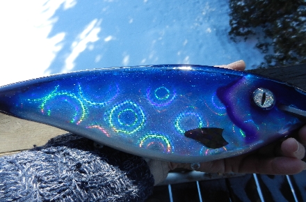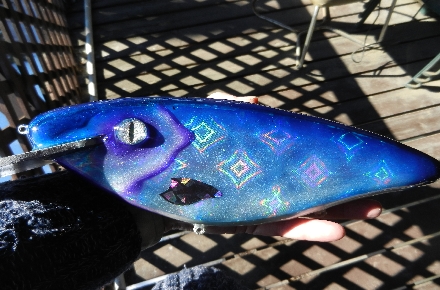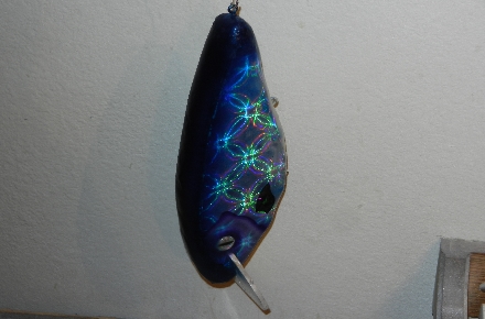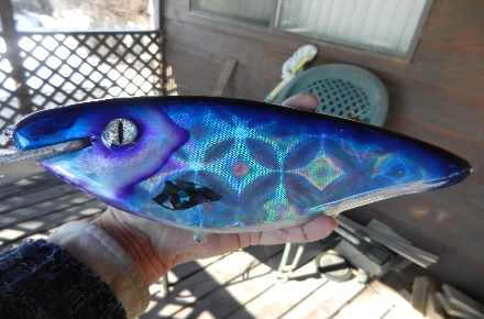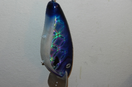 Some of the new holographic lure foils really provide a variety of different looks depending on the angle of incidence. Here are a few shots of a 12" basswood lure with aluminum lip and one rattle chamber.