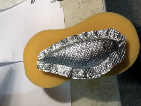 Posts: 117 | I use regular aluminum ducting foil tape. Trace out the side profile of the lure, and cut it out. I then usually (unless you want a smooth look) press the foil into a steel mesh, like stucco metal lathe, or whatever else (some guys use handles of ratchets for a knurled look) to get a design. Very carefully line up and stick the foil onto the bait making sure I don't have any bubbles. I press down and smooth the edges with a bone folder (any smooth plastic surface will do, like a pen). Sometimes I cut out other shapes like gills, or mouth pieces to accent the lure as well. Then I epoxy over to get a smooth surface, paint (usually with transparents to get that shine show through), then final finishing epoxy layers. I recently got into cutting strips of foil out with scalloped shears and painstakingly put layers of these strips on the lure to create foil scales! I really love that look, but it takes a long time! YouTube has many great videos of guys foiling lures. There is also a great and very active facebook group designated strictly to foiling baits (lots of guys heat press nail foil onto lures, something I'm not familiar with). It's called Custom foiled lures. Foiling is a fun way of quickly creating depth and shine into a lure. Make sure you start out with a real smooth surface, and take your time with the edges and details. Edited by Eastman03 3/28/2019 1:12 PM Attachments ---------------- IMG_0152.JPG (115KB - 994 downloads) | ||