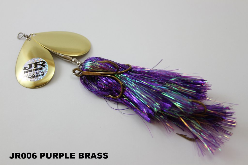 Really looks like a Muskie Mayhem JR Double Cowgirl in purple/brass. Carried by "lots" of retailers. Try Rollie & Helen's Musky Shop.