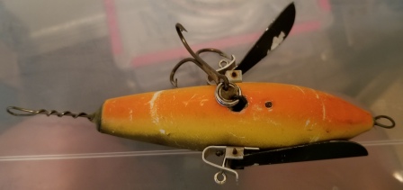 Every once in a while I'll run across one of my lures from the 80s like this converted threw wire creeper that still has the size #5 inside a #7 split ring configuration (yeah it had chintzy screw eyes) . For those newer to the sport, we did the 2 ring modification after noticing split rings would sometimes egg shape after a good fish, the ring inside the ring prevented that from happening. That's a swivel in the belly, the extra long tail wire was to get a nipper... the hot glue in the rings was just another failed attempt to keep the hook from tangling on the wing.