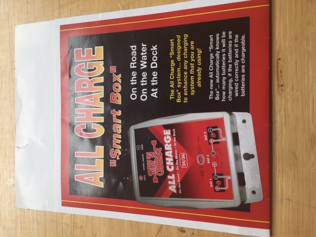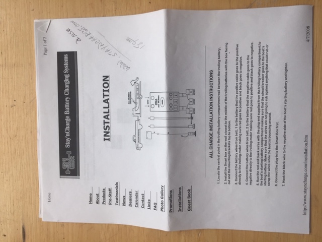 Stay'n Charge on board trolling motor charger will charge the trolling batteries while running the big motor...works well to top off batteries and allows for long days of fishing. Simple connection with starting battery ang trolling motor batteries...will work with both 24 and 36 volt systems...$125