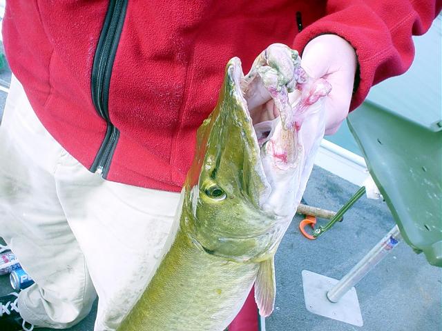 Posts: 1769 Location: Algonquin, ILL | Looks to me like ToddM did a Jimmy Houston and kissed it on the lips ( Just Kidding Todd hope to run into you at the Chicago show again ) other than that I agree it looks like stringer damage as the rest of the fish looks to be fine, what a waste Edited by JohnMD 12/8/2003 12:34 PM | ||