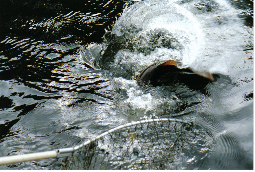 Location: Hayward WI | My story starts during my introduction into muskie fishing from my now wife. She was born and raised in Hayward, and after a few years of dating, figured I had the right stuff to be a muskie fisherman. Anyways, it was July of 1994, fishing the Phipps Flowage north of Hayward. I was casting yellow bucktail I picked up on the way to her place, trying not to get another backlash and pretending I knew what I was doing. Beginners luck struck and so did the muskie, somewhere in the upper 40" range. Chaos insued as it was the largest 'ski the wife had seen hooked on "her" river. She grabbed the net and in the excitement took a stab at the fish as it made a pass by the boat, and half the fish was in, but the bucktails hooks were caught in a non-coated net and a good head shake and my first muskie was history. Here's a cool picture of the fish seconds before the premature release occured. You can see the yellow bucktail just inside the hoop. Edited by erico 12/17/2003 9:49 PM Attachments ---------------- theonethatgotaway.jpg (190KB - 168 downloads) | ||