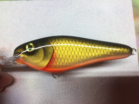 Eastman, the bottom of this bait was painted in Createx transparent orange, and then dusted over with fluorescent orange on the lowest part of the belly.