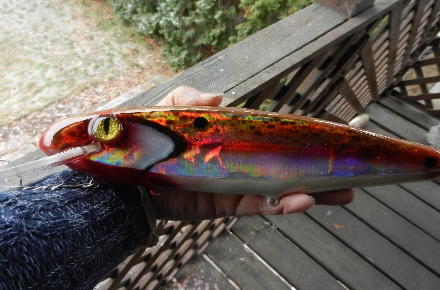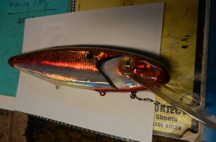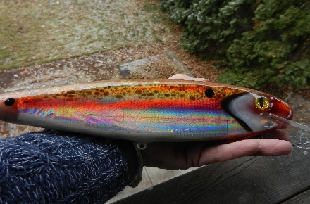 Like refried beans, I had to do this lure twice. Didn't like the original looks, sanded the whole thing back to wood and started over. 12", basswood, two rattle chambers, lacquer and holographic foil.