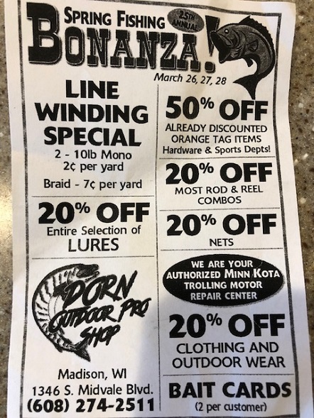 Here is Dorn's flyer for their big spring sale. March 26-28. Dorn's is a family run business that has been a great supporter of the Capital City Chapter of Muskies Inc. for many years. They just got pretty well stocked up for the sale lots of deals to be had.