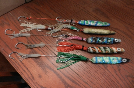 The second photo is of a few 16 oz jigs I made for next year's fishing trip. By the way, I caught a 220 pound halibut (released) in 2021 on a similar jig. Most are make from glow powder paints in white, green, and blue.