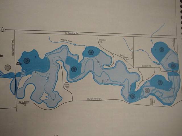 Posts: 1137 Location: Holly, MI | Cool pic of the little ones. This lake is pretty good size at 1270 acres. It is a dammed off river with a river in on the left of the pic. This pic is about 1/2 the lake. Max depth is 30 feet with most of the lake at about 5-10 ft. Sounds like there might be some decent fish worth chasing already. Look at the map pictured on the link and tell me where and how you would fish this lake. I know there is a lot of data missing like underwater structure etc but do your best. Zebra mussles have cleaned up the water and the weed growth has risen as expected. The water is light brown but good visability for sight fishing. Help me with the map game. I'm tired of filing hooks, making new lures, cleaning reels, etc. Time to think about actual FISHING!! Attachments ---------------- Fishing 012.jpg (151KB - 336 downloads) | ||