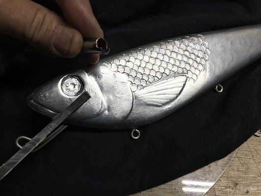 Here is a 10" foiled bait with carved gills and fins. The scales are pressed into the foil with this metal tube that I cut as shown in the pic. It takes a bit more time doing them one at a time, but makes a pretty cool scale pattern.