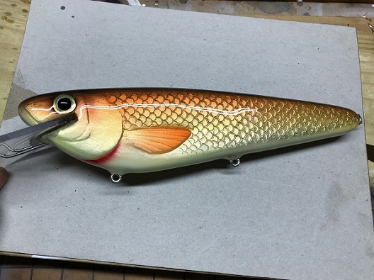 More Muskie Fishing -> Basement Baits and Custom Lure Painting -> Scaled foil bait