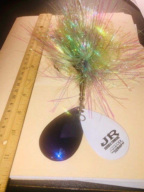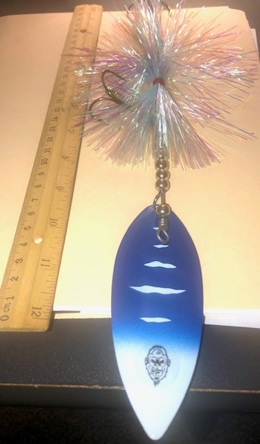 Sasquatch Lures- Huge #10 Single Willow Blade - Blue/White Blade with Iridescent Skirt: Will Sell for $16 Shipped to you (reduced by $2 on 1.13.23)