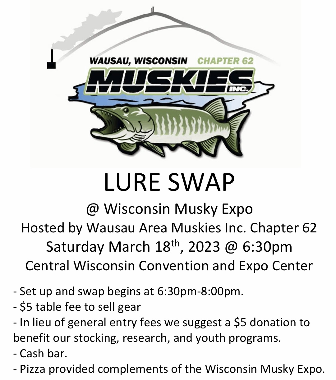 Posts: 91 Location: Central Wisconsin | LURE SWAP @ Wisconsin Musky Expo Hosted by Wausau Area Muskies Inc. Chapter 62 Saturday March 18th, 2023 @ 6:30pm Central Wisconsin Convention and Expo Center - Set up and swap begins at 6:30pm-8:00pm. - $5 table fee to sell gear - In lieu of general entry fees we suggest a $5 donation to benefit our stocking, research, and youth programs. - Cash bar. - Pizza provided complements of the Wisconsin Musky Expo. Attachments ---------------- F601C7F6-CF2F-49BC-B9D3-2019C67934AA.jpeg (277KB - 131 downloads) | ||