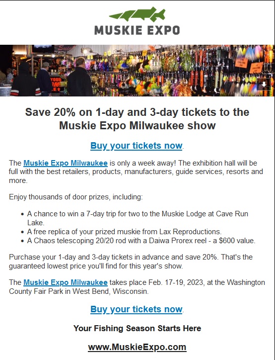 Subject: Milwaukee Muskie Expo 20% off Ticket Sale!