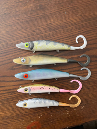 The large version is an 8inch body the small version is a 6 1/2inch body. Tails are held on by a thread pin without glue. I have ones still on the original tail with close to 100 pike caught on them