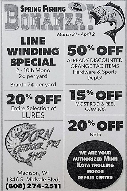 Dorn's Outdoor Proshop in Madison WI is having their big spring annual sale. Stop in for some great deals. Lots of New and custom Musky lures just arrived.... Instore only. See attached flyer. I will be there answering questions Friday from 7am-1pm. Great family ran business and have been a great supporter of our local Muskie's Inc club.