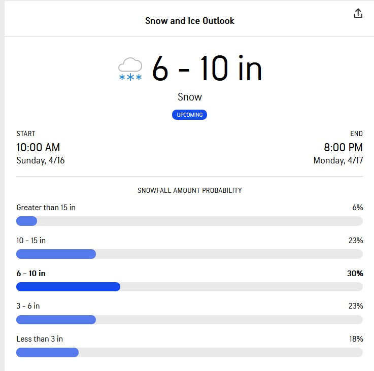 Posts: 1 | Kirby Budrow - 4/19/2023 3:34 PM We're supposed to get 6-12" tonight and tomorrow Goddam that's rough | ||