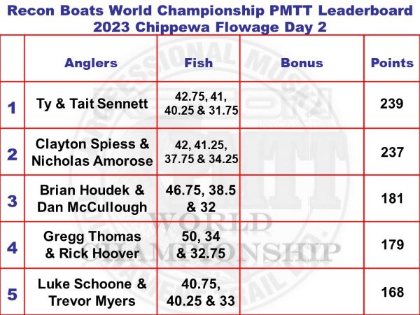 The fish were hungry for Day 2 of the PMTT 25th Anniversary Recon Boats World Championship on the Historic Chippewa Flowage. 26 muskies were caught today with 13 yesterday for a 2 day total of 39 fish and 23 teams qualifying to fish the 3rd and final day tomorrow, where the winner will go home with a Recon Boat powered by a Mercury Motor for a 1st Place prize package in excess of $50,000.