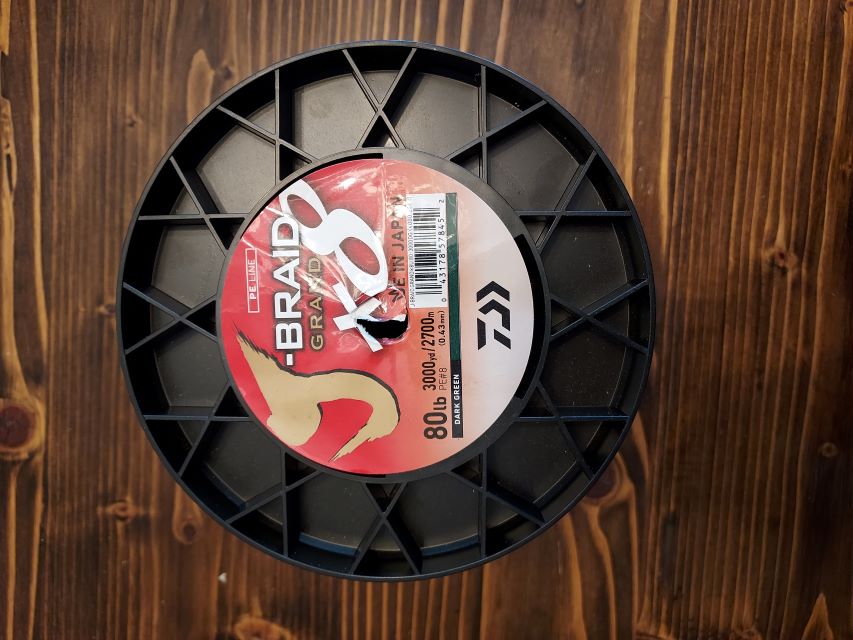 3000 yd spool of 80# dark green Diawa JBraid X8, with approximately 400 yards used, so about 2600 left.