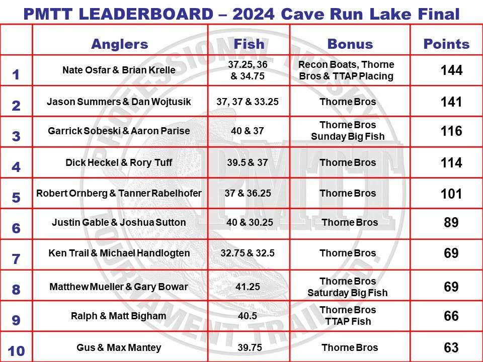 Nate Osfar & Brian Krelle Win PMTT 2024 Q1 Cave Run Lake Event with 3 fish a 37.25”, 36” & 34.75”