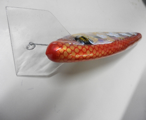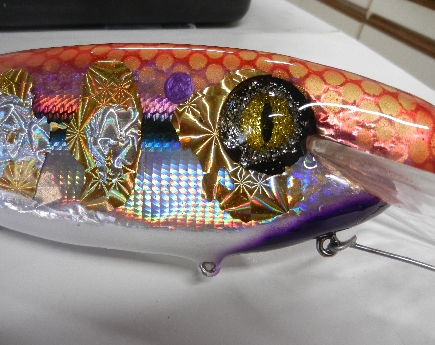 I mix painting with various forms of siding, rarely do a pure paint lure. On this lure the back was pearl red acrylic with pearl gold spots, the sides had red lacquer near the back and a green lacquer stripe down the center. I prefer lacquers to acrylics when shooting over highly reflective surfaces because they are more consistently transparent. Not much really shows up on this lure because I overamped the hot foil additions.