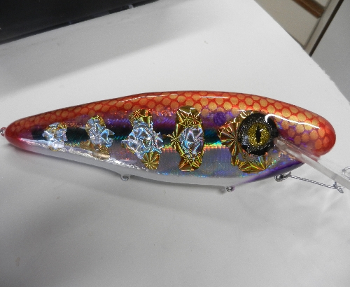 I'm still experimenting with gluing hot foil down with epoxy rather than applying heat to make it stick. 12" basswood, one rattle chamber, plexiglass squarebill, three types of hotfoil. Something of a mishmash.