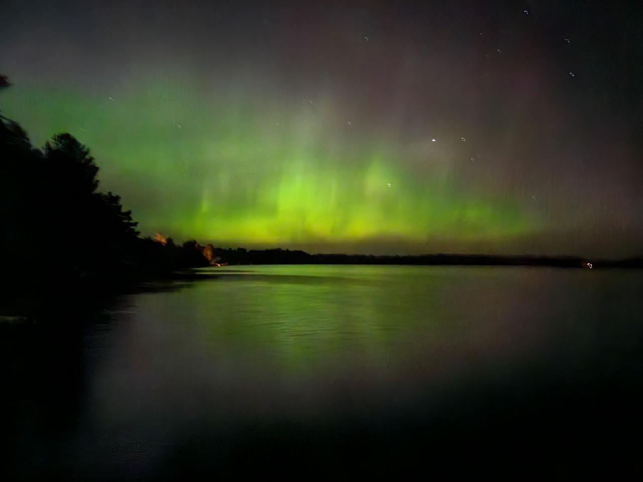 | Thanks for the reminder! They have been very bright tonight, bright enough to reflect lines on the lake. Not sure I have seen that here before. By the way, my neighbor got some spectacular shots with his cell, using settings he found on google, showing reds and greens not visible to the naked eye. I can see a little green but nothing like what his cell photos are showing. Had no idea a cell could take that type of photo. | |||