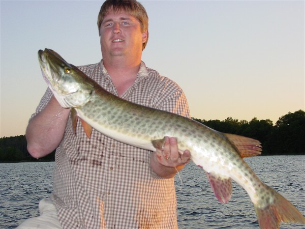 I think pike colored lures are under utilized, especially on waters that contain alot of small pike. This 43"er hit a Depthraider tipped with about a 18" pike.