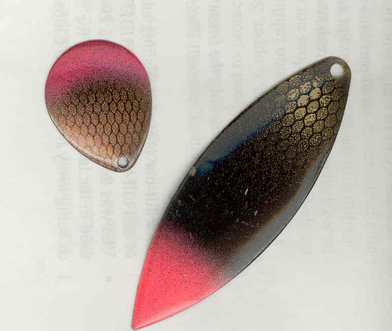 Posts: 1335 Location: Chicago, Beverly | Here is a link to an article about Painted Hooks by Walleye pro Bill Reabe: http://www.walleyecentral.com/reabe-hooks.htm (Hawg Wild of Altoona Wi is now known as Luretech). This is the line in the article that makes all the difference between Luretech's and all the imatations: "Since his paint is not a fluorescent paint but is actually powered by ultraviolet it will stay glowing under water during the day and even at night if its a clear night and there are stars out." You CAN see red painted hooks at most any depth when they are Power Glow. I don't have a pic of what his hooks look like, but its the same paint as his blades.. (Those are teeth marks in the willow blade) Edited by kevin 6/23/2004 7:35 PM Attachments ---------------- boettcher blades.jpg (38KB - 115 downloads) | ||