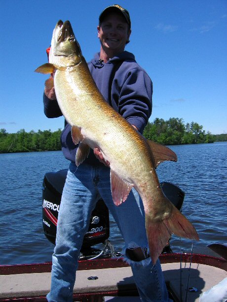 Well, I got to play net boy to my son Jim who took 2 in the 30,s Friday, and Sunday, and Saturday a 47 x 18, all at LOTW, Sabaskong Bay.The 47 was taken at 5 p.m. on a brass spoon on a figure 8, after the fish missed it at the boat on a previous cast.Friday was the dissapointing day with over a dozen follows from 5:30-6:30 p.m. from all size Muskies off of one island.I lost a large Musky who got me into the heavy weeds, and I couldn,t get him out to open water, before he shook the hook on me, off that same island.Same island had about a 15-16 pound Northern come flying at my son,s bucktail missed it twice on the 8, and then did a 180 and snapped at my grandson,s spinnerbait that was in the water, and missed that also.I swear that fish had a definite sight problem.