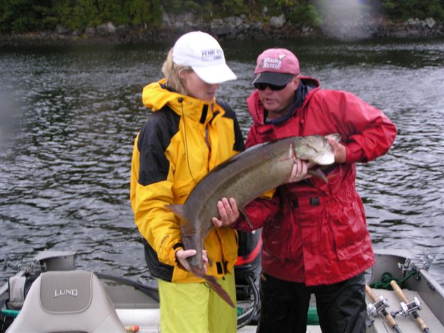 Fishing the Moon with Jodi is an awsome experience. Canadian sheild, sheer cliffs, isolated cabbage surrounded by 80 ft of water, winds that can move the water level in the Moon by inches in a day, a guide that puts you on spot after spot with always the potential for a serious heavey (maybe even a world record)! And, the occassional fat 44"! (pic of my wife's 44" enclosed).