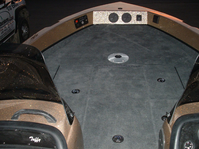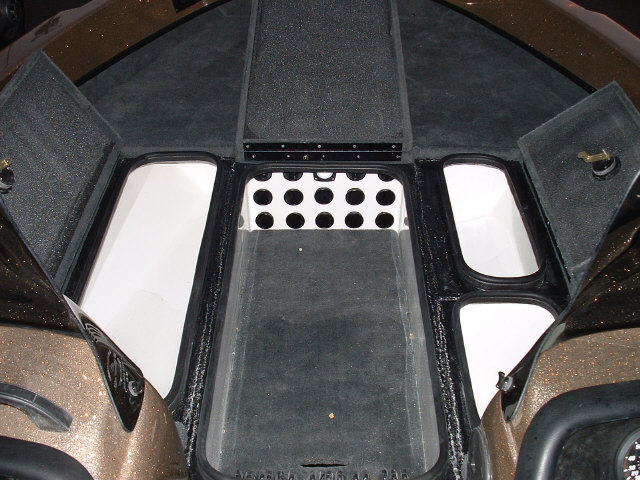 Posts: 32954 Location: Rhinelander, Wisconsin | A sneak peek. Zach has much better shots and will post them soon. Gas tank 4' forward and batteries 3' forward from past models. The boat is dead level at rest. 52" Livewell, with Frabill inserts, rear. Fully sealed dry fiberglass locker storage. Huge cooler. Available added removable rear deck module which adds 66" by 13" by 16" dry storage. Rated at 250 HP. 100% composite. PLENTY of room for 4 in the rear. Rod locker accepts 91/2'rods with ease, 14 rods in the locker. HUGE front deck. Avialable in a tiller rated at 150 HP, Side console and dual console. 50 gallon fuel tank. 26.5 inch transom with cut out to 25" at motor well, no water in the splashwell backing up. Zach is rigging this thing with a Mercury optimax 250 XS, and a Pro Kicker. ZOOOOOOOOOOOOOOOOOOOOOOOOOOOOOOOOOOOOOM! Attachments ---------------- DSCF0020.JPG (94KB - 165 downloads) DSCF0017.JPG (86KB - 191 downloads) DSCF0016.JPG (90KB - 183 downloads) | ||