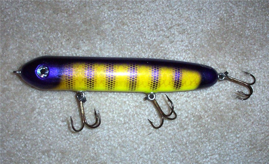 Posts: 457 Location: Minneconia | It's unbelievable what Beav can do with an airbrush. This lure was destroyed, the clear coat was gone(after about two days) and there were giant gouges from the "T'd" hooks, not to mention multiple musky maulings. Thanks Beav! Attachments ---------------- Purple Thunder.jpg (158KB - 124 downloads) | ||