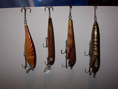 Posts: 3514 Location: Elk River, Minnesota | These baits have been in my box, but have either not been used, or used very little. They are taking up space. Make me a REASONABLE offer for whatever baits you are interested in. Buyer will be responsible to pay the minimal shipping costs. In the crankbaits and Jerkbaits there is an older 6 inch reef hawg in walleye color. This was purchased in the mid to late 80s. The Jerko was tossed a couple of times last year, the Cisco Kid has seen little use, and the rapala has seen little use. The Twitch baits are unused. They are all 10 inchers. The one on the left I believe is a grandma and the other two I do not know...but they are funky colors.. I also have the following which have seen more frequent use and show some age...an older yellow w/copper bladed harasser, and a custom tail made for Marv Koep which has a #7 fluted blade w/bright yellow tail. These bucktails are not too bad...pretty much some surface rust on the hooks and scratches on the back side of the blade of the harasser from dangling in the box. I have a grey and pink topraider which still has original hooks on it. This has been casted a bit and has some hook rash, but not bad. Edited by VMS 1/28/2005 7:54 PM Attachments ---------------- Jerks and cranks.JPG (14KB - 77 downloads) twitch baits.JPG (12KB - 69 downloads) Jerks and cranks.JPG (14KB - 66 downloads) | ||