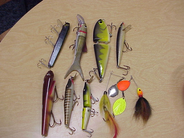 7" Black Jimmy(fair), Golden Walleye Deep-Invader (good), Black Perch ACE (like new), 7" Black/White Rapala(fair) 8" Brown/White Reef Hawg (good), Brown/White Creek Chub(like new), Black/Green Creek Chub (like new), Safety Pin Spiner (fair) and Dual Balde Safety Pin Spiner(fair).