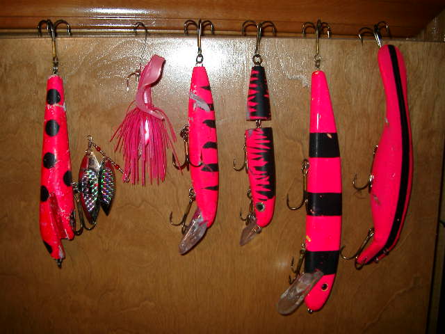 I just got a 9" Hot-pink bandit GSB from Danzyck lures..it adds so much color to my box of lures.. oh it also looks like it will be killer in the tea colored water of lower red. it looks like the kind of lure that glows all the way back to the boat.. I cant wait till i get to actually use the darn thing..