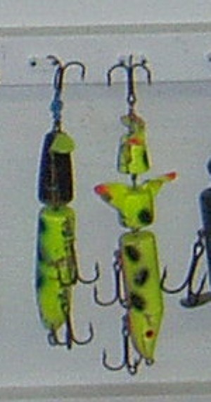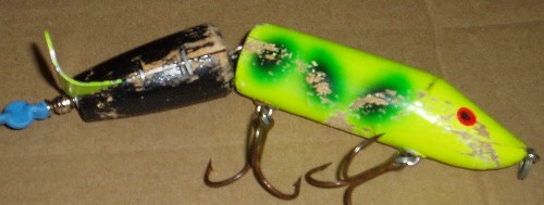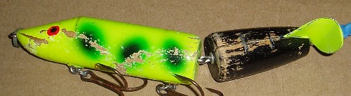 | The guy in VW bought a lot of bodies and assembled them himself. The originals did have staples on the tail section and a metal bead. This guy uses a plastic one and he has someone paint them for him. As close to the original as your gonna get. When all esle fails I'll put one on. Still one of the best topwaters. I bought a couple from ebay and a frind of mine bought 8. | |||