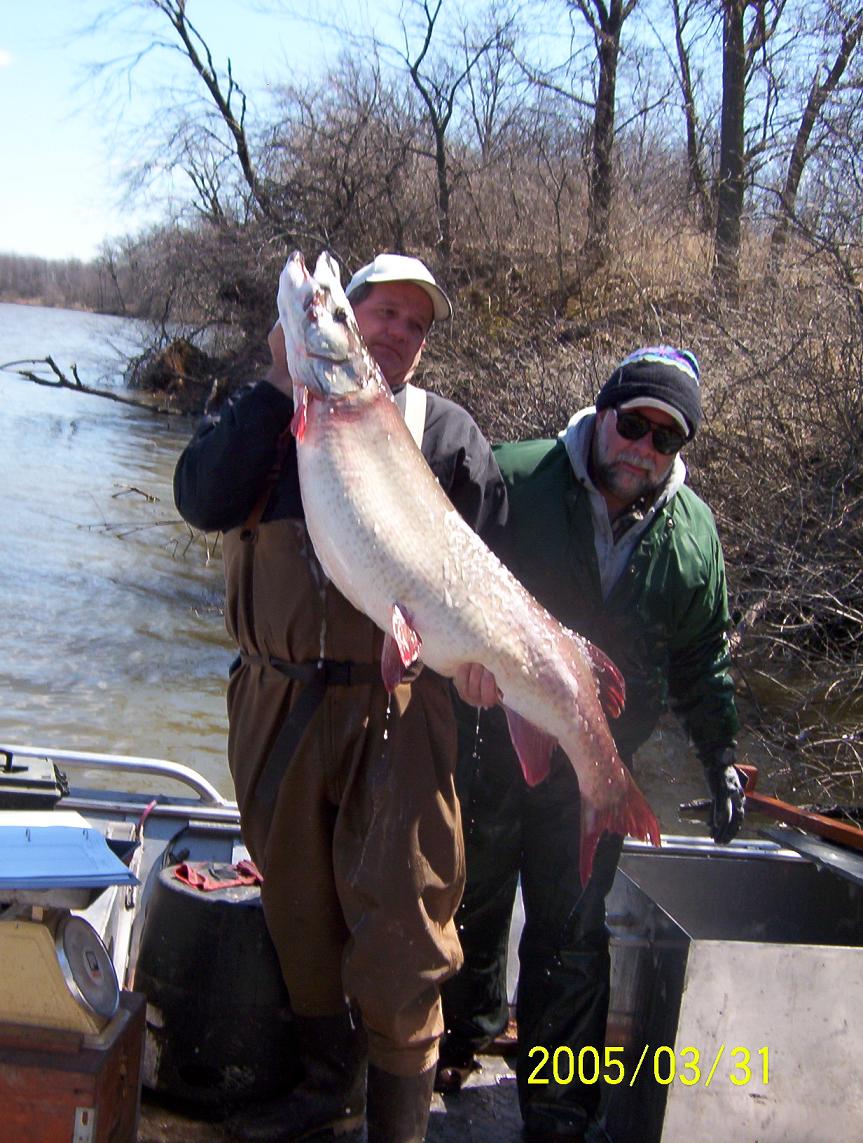 Posts: 323 | Today's Peoria Journal Star has pics of a fattie netted by the DNR last week. It was 49 3/4" by 25" girth and weighed 43-5 lbs which would shatter the state record of 38-8. The net that contained the fish had 12 muskies in it with an average length of 42". Also, Tuesday a state record saugeye was netted there also. It was 29.5" and weighed 12-7 which would also smash the current record of 9-10.88lbs. Both pics are in todays Peoria Journal Star. If you like big girls, you'll loves these pics!!!!!!! | ||